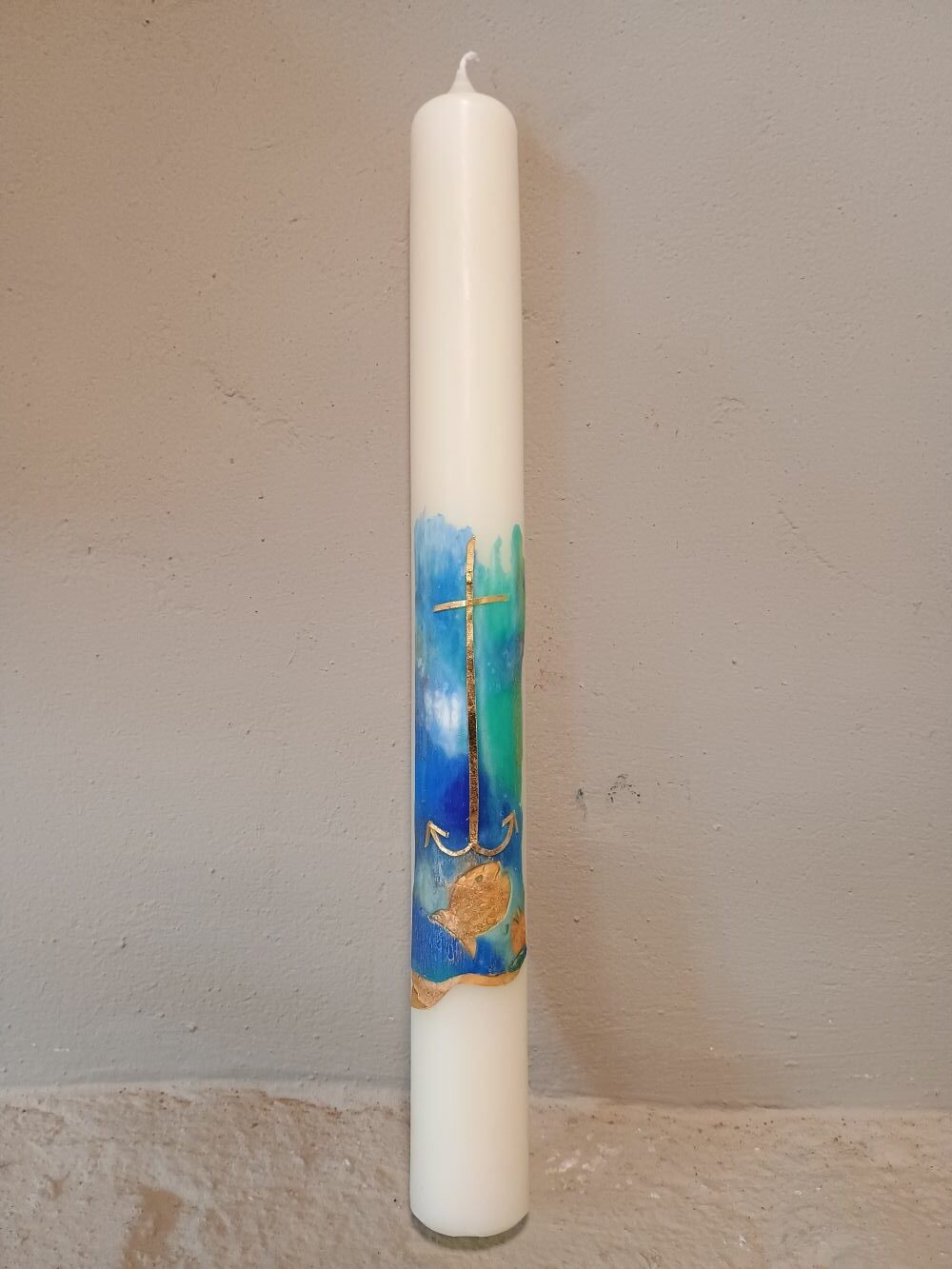 Dieses Taufkerzen-Unikat ist in liebevoller Handarbeit in unserer Kerzenwerkstatt entstanden.