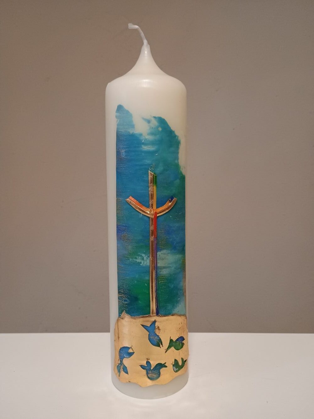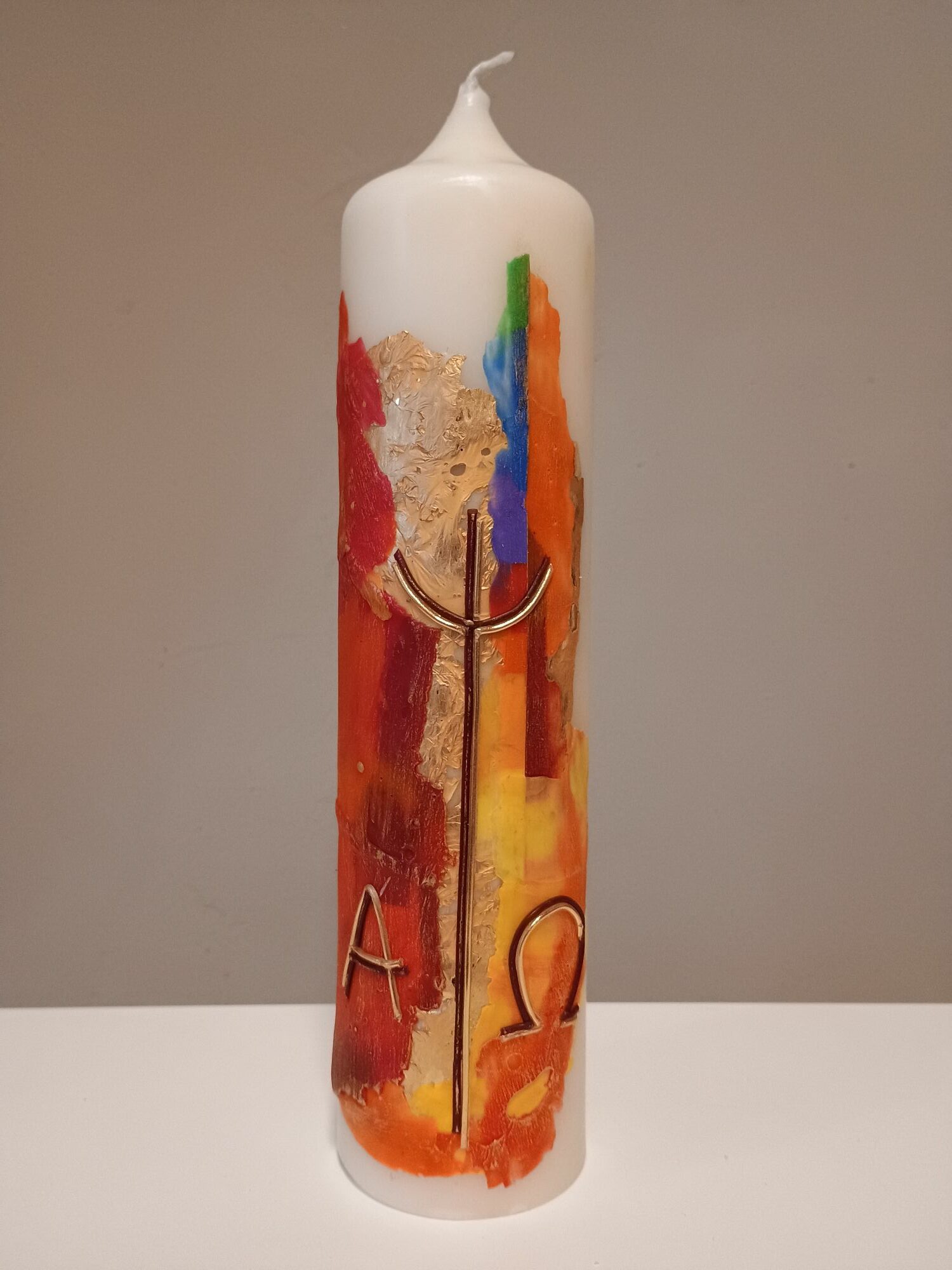 Diese großformatige Osterkerze ist in liebevoller Handarbeit nach eigenem künstlerischem Entwurf in unserer Kerzenwerkstatt entstanden.