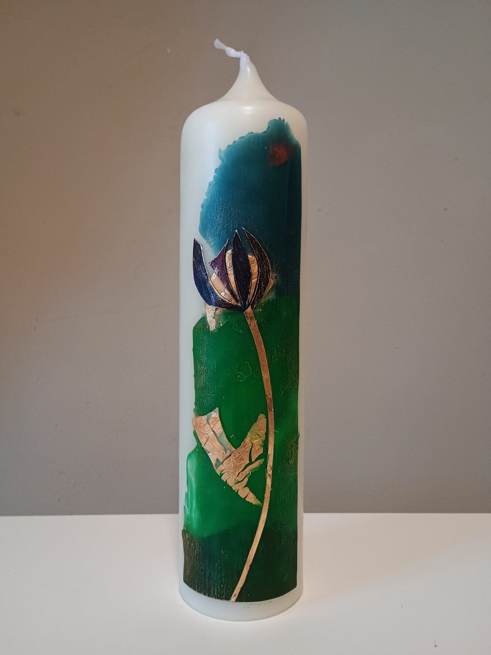 Dieses Unikat ist in liebevoller Handarbeit nach eigenem künstlerischem Entwurf in unserer Kerzenwerkstatt entstanden.